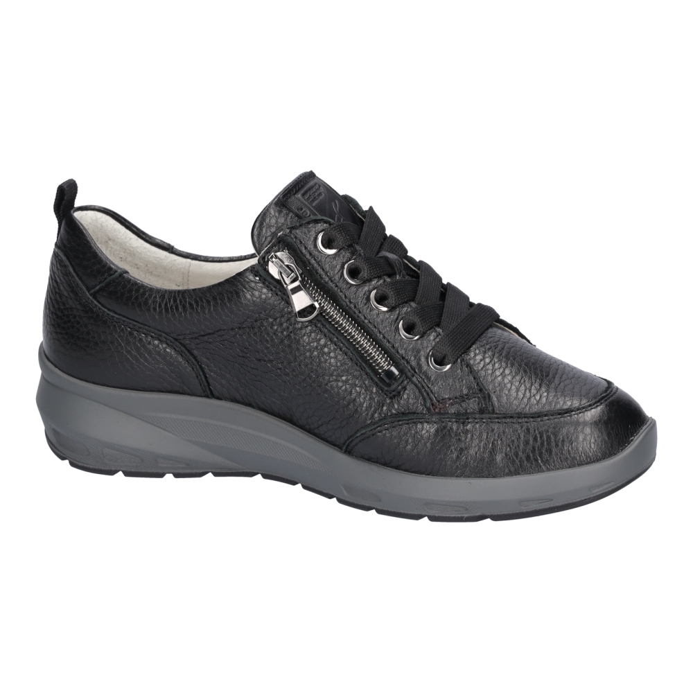 Typ: półbuty damskie Kolor: czarny Materiał wierzchni: skóra naturalna Wnętrze buta: wyjmowana wkładka skórzana, Wysokość klinu: 40 mm Dodatkowe informacje: Obuwie wykonane z bardzo miękkiej i wytrzymałej skóry jelenia. Wyjmowana wkładka daje możliwość wymiany na własną wkładkę ortopedyczną. Solidna antypoślizgowa podeszwa amortyzuje mikro-wstrząsy. Sznurówki pozwalają na idealne dopasowanie do stopy, dwa suwaki po bokach umożliwiają zakładanie bez rozsznurowywania. Obuwie lekkie i elastyczne.