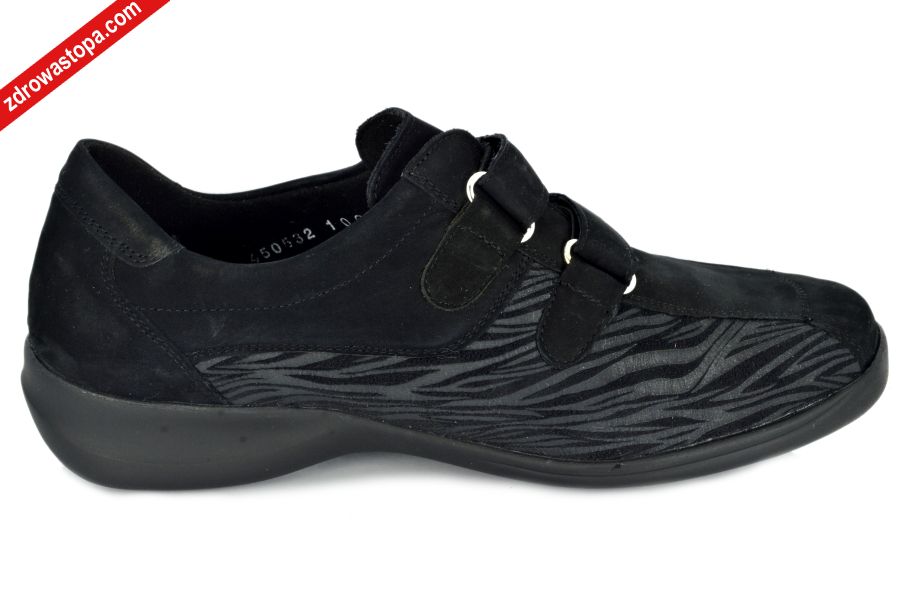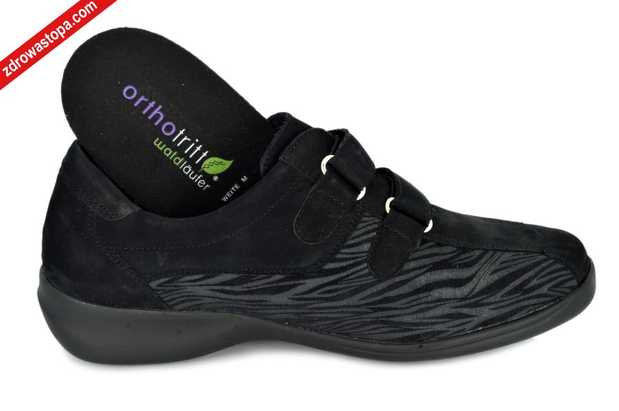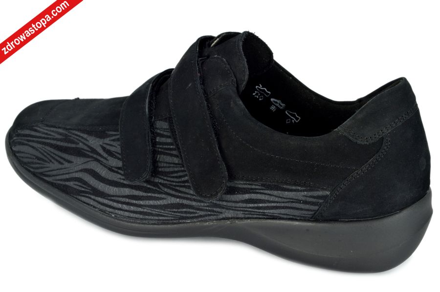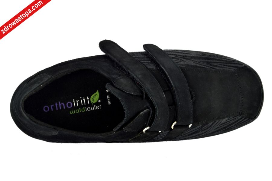 Typ: półbuty damskie Kolor: czarny – schwarz Tęgość: M Materiał wierzchni: skóra naturalna i elastyczna materiał Wnętrze buta: wyjątkowo miękki materiał tekstylny Dodatkowe informacje: Minimalna ilość przeszyć i łączeń, lekka antypoślizgowa podeszwa, mogą być stosowane przez osoby z tzw. „zespołem stopy cukrzycowej”. Boczne ścianki wykonane z elastycznej eko skóry. Wyjmowana wkładka. Jest to specjalne obuwie z linii „Orthotritt”. Spełnią oczekiwania najbardziej wymagających odbiorców.