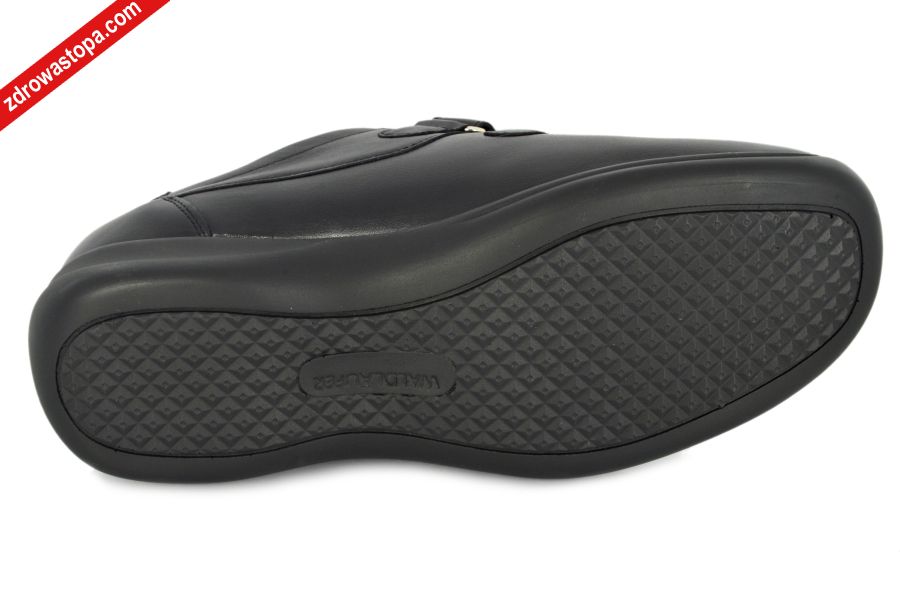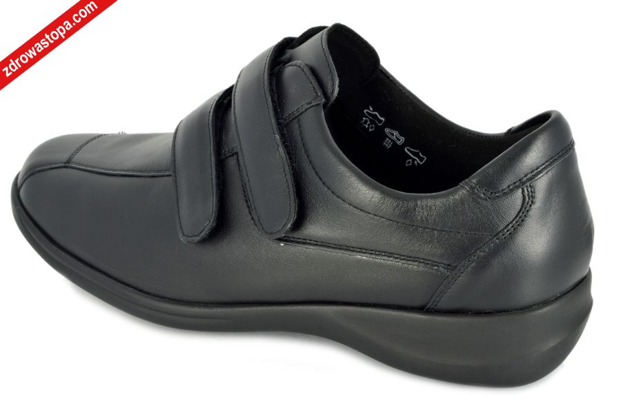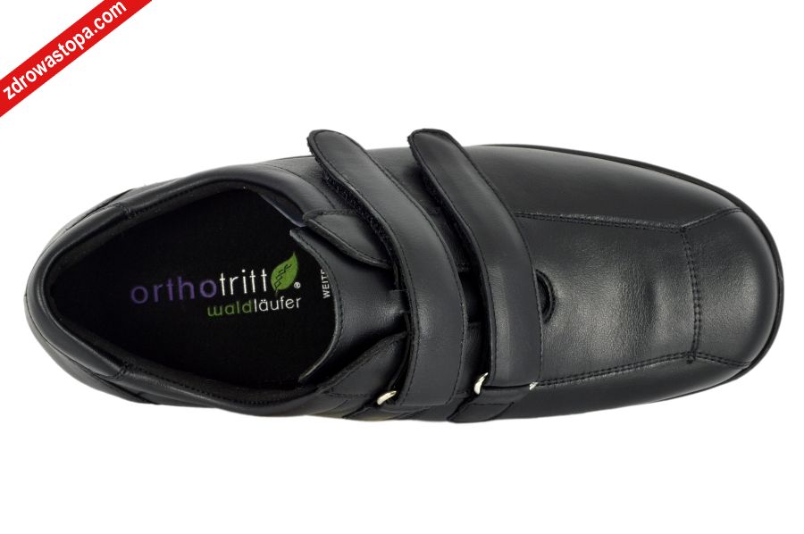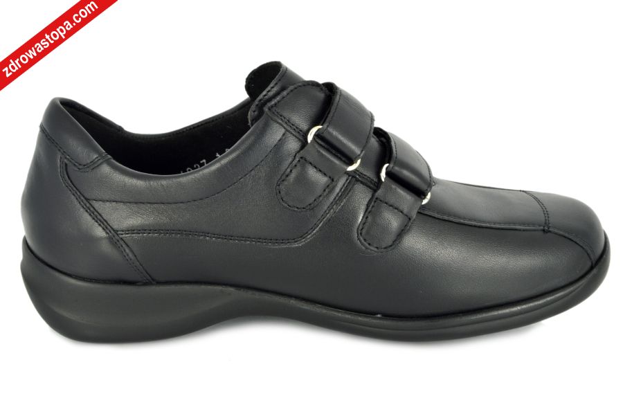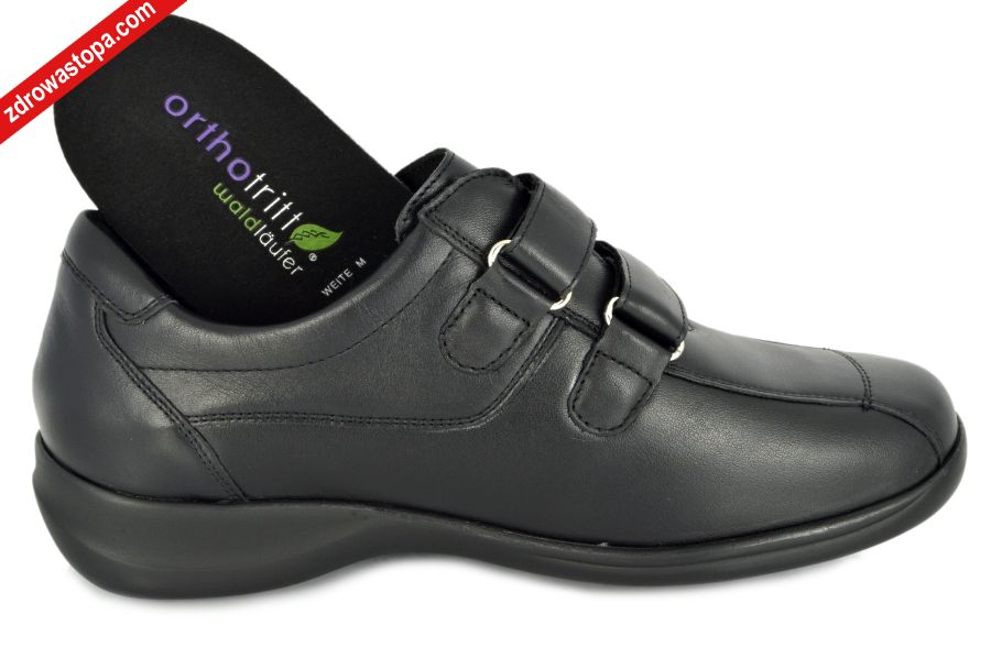 Typ: półbuty damskie Kolor: czarny – schwarz Tęgość: M Materiał wierzchni: skóra naturalna i elastyczna eko skóra Wnętrze buta: wyjątkowo miękki materiał tekstylny Dodatkowe informacje: Minimalna ilość przeszyć i łączeń, lekka antypoślizgowa podeszwa, mogą być stosowane przez osoby z tzw. „zespołem stopy cukrzycowej”. Boczne ścianki wykonane z elastycznej eko skóry. Wyjmowana wkładka. Jest to specjalne obuwie z linii „Orthotritt”. Spełnią oczekiwania najbardziej wymagających odbiorców.